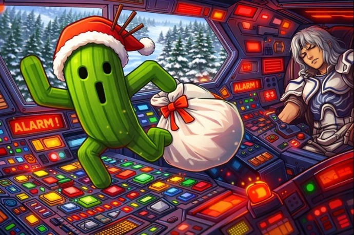 Tu te lances à sa poursuite jusqu’à la Grande Baleine, le vaisseau que le Gros Chocobo utilise pour parcourir le monde et distribuer ses cadeaux. Le Pampa Grinch s’engouffre dans le cockpit, éjecte Cécil le pilote sans ménagement, puis se met à marteler les commandes au hasard. La Grande Baleine décolle brusquement.
