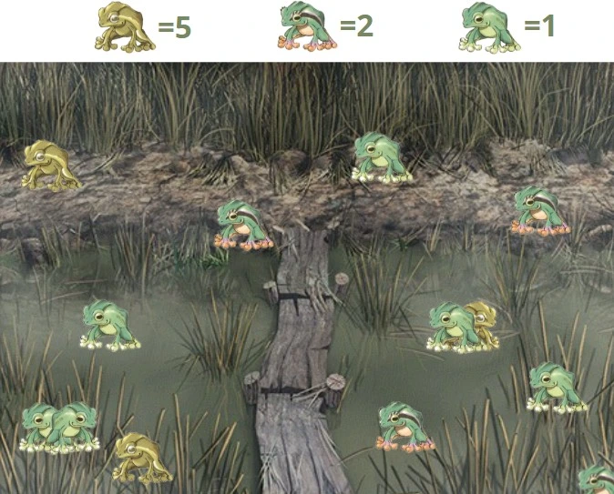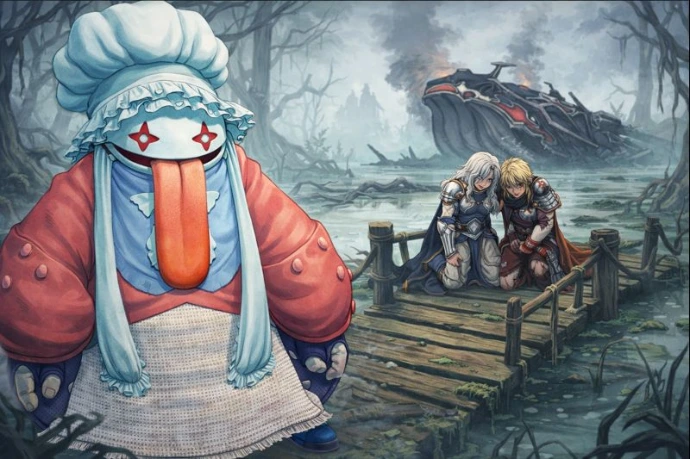 Cécil vous secoue et vous aide à sortir. À peine remis, vous constatez que la Grande Baleine gît, brisée, au cœur du Marais des Kwe. Sur l’autre rive, Kweena vous interpelle avec colère : « Hé, toi ! Tu as fait fuir toutes mes grenouilles avec ton énorme machin bleu ! Attrape-les toutes ! Je ne te laisserai pas t’échapper comme l’autre truc vert qui s’est enfui vers le village ! »